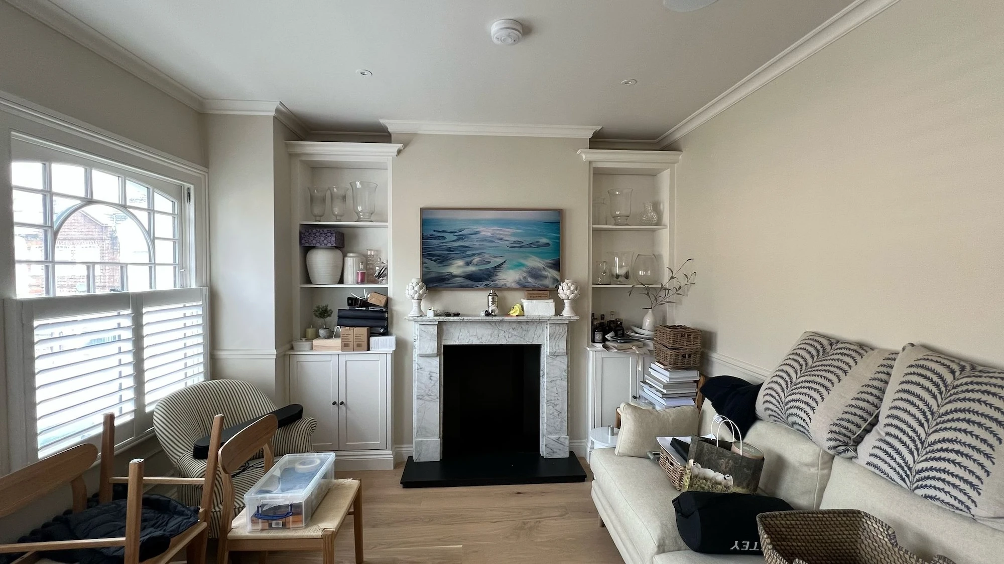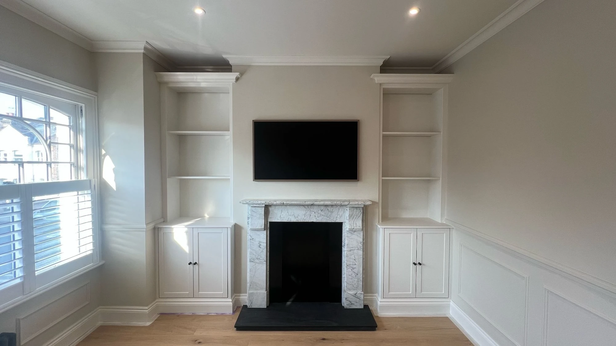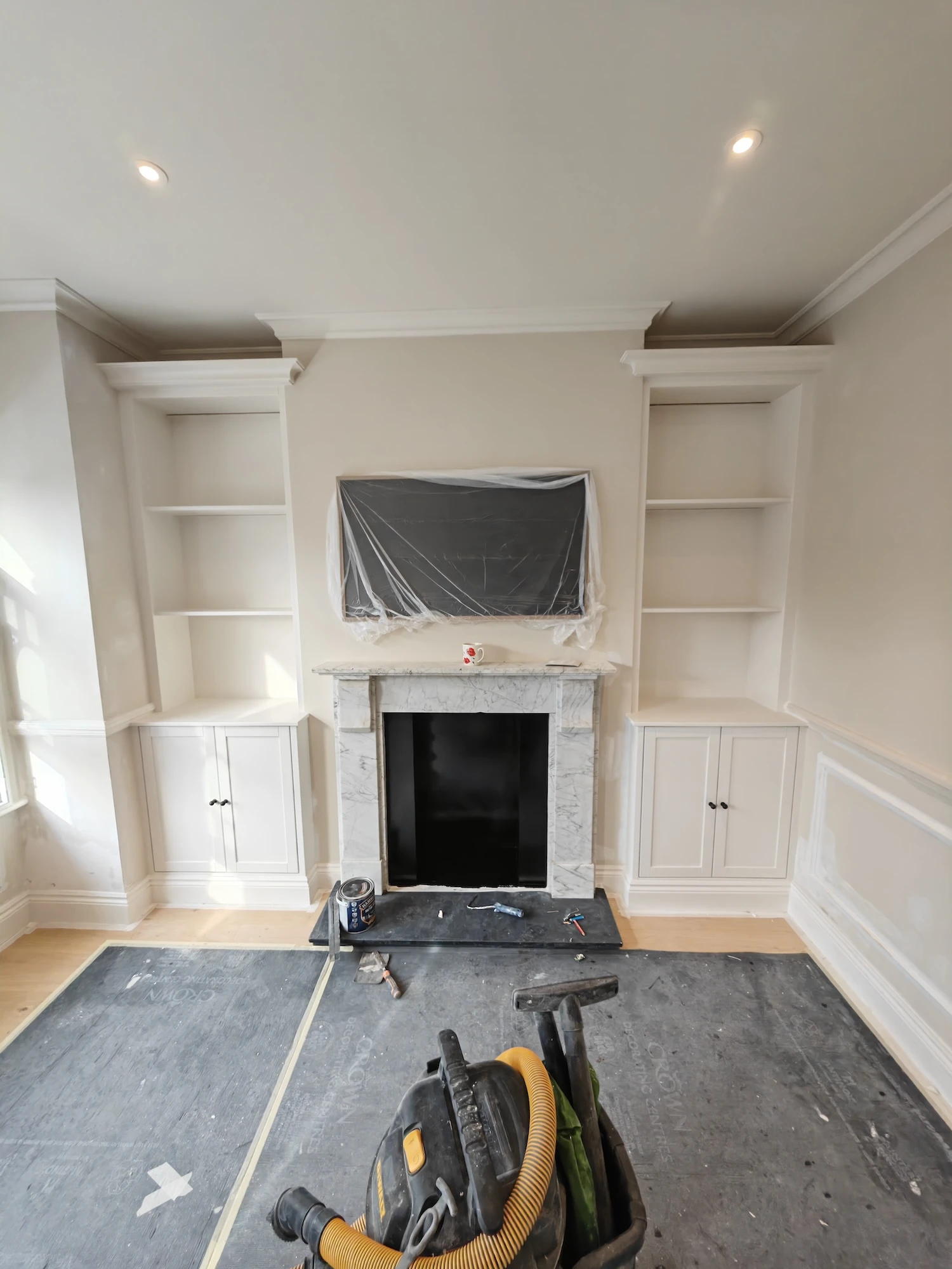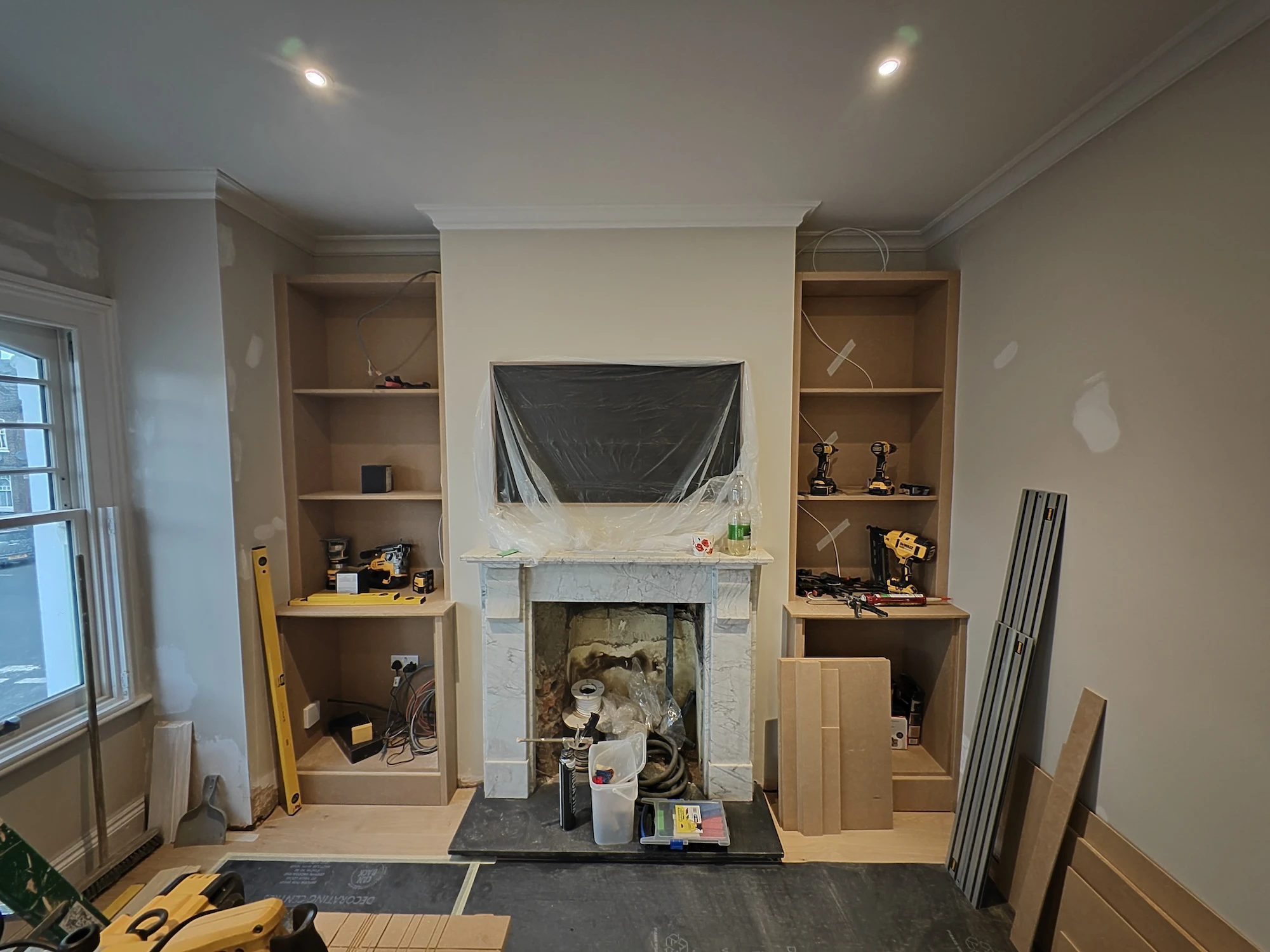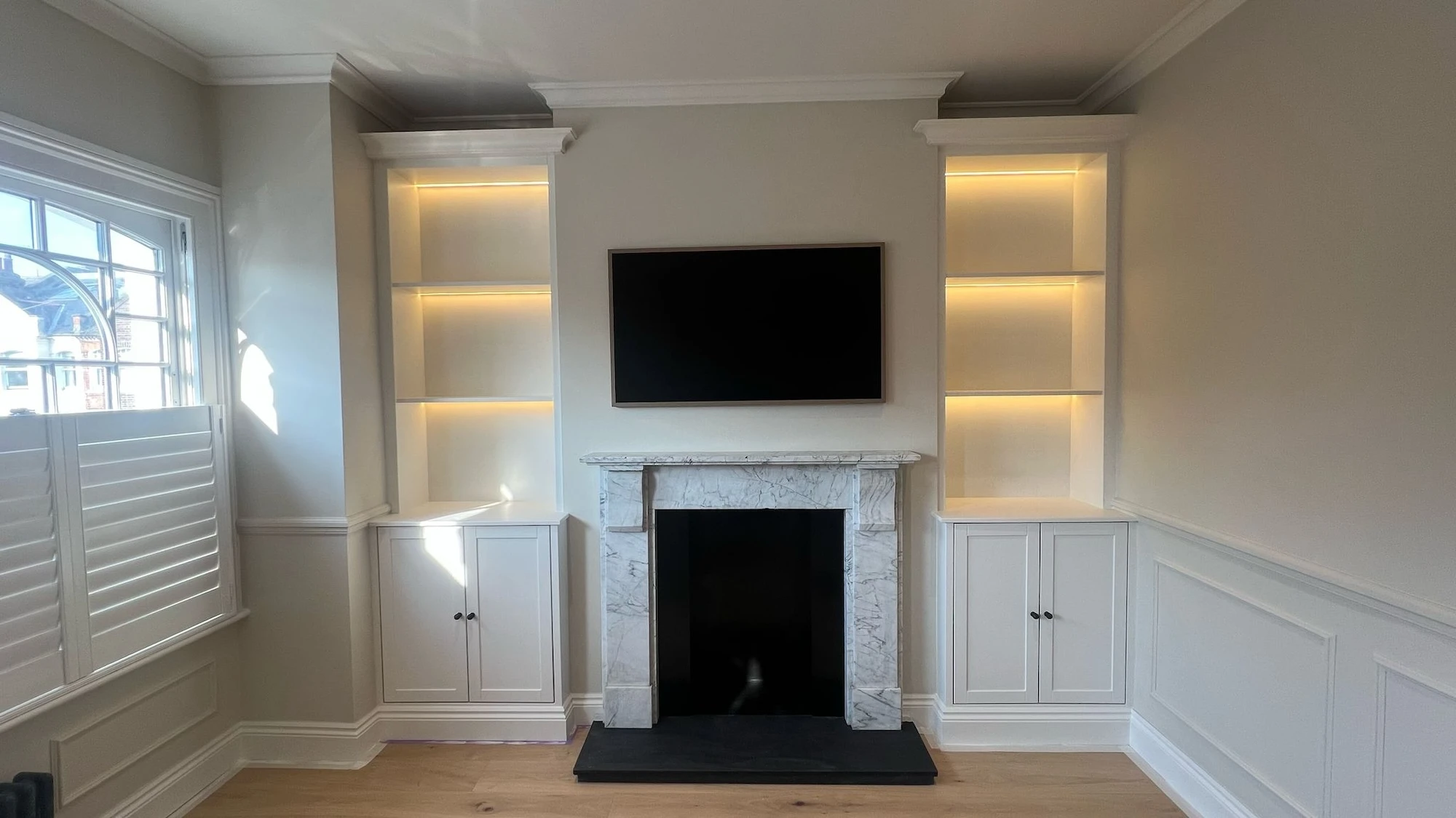 In addition, we installed a series of alcove cabinets downstairs in the living room, creating elegant built-in storage that complements the new decor. These units were fitted precisely between existing architectural features and finished with tailored shelving and concealed joinery for a clean, integrated look. Subtle LED lighting was incorporated to enhance usability and ambience.