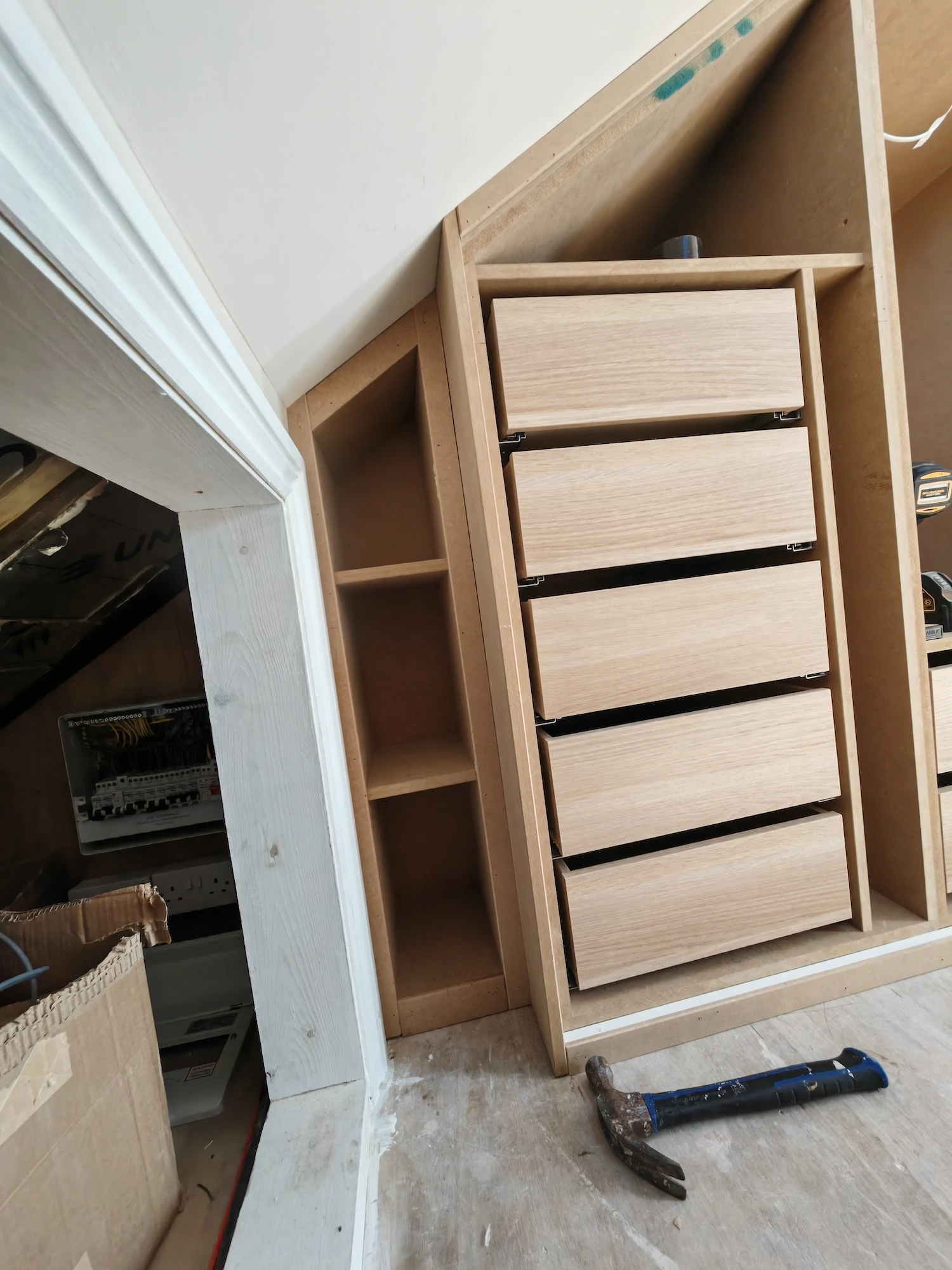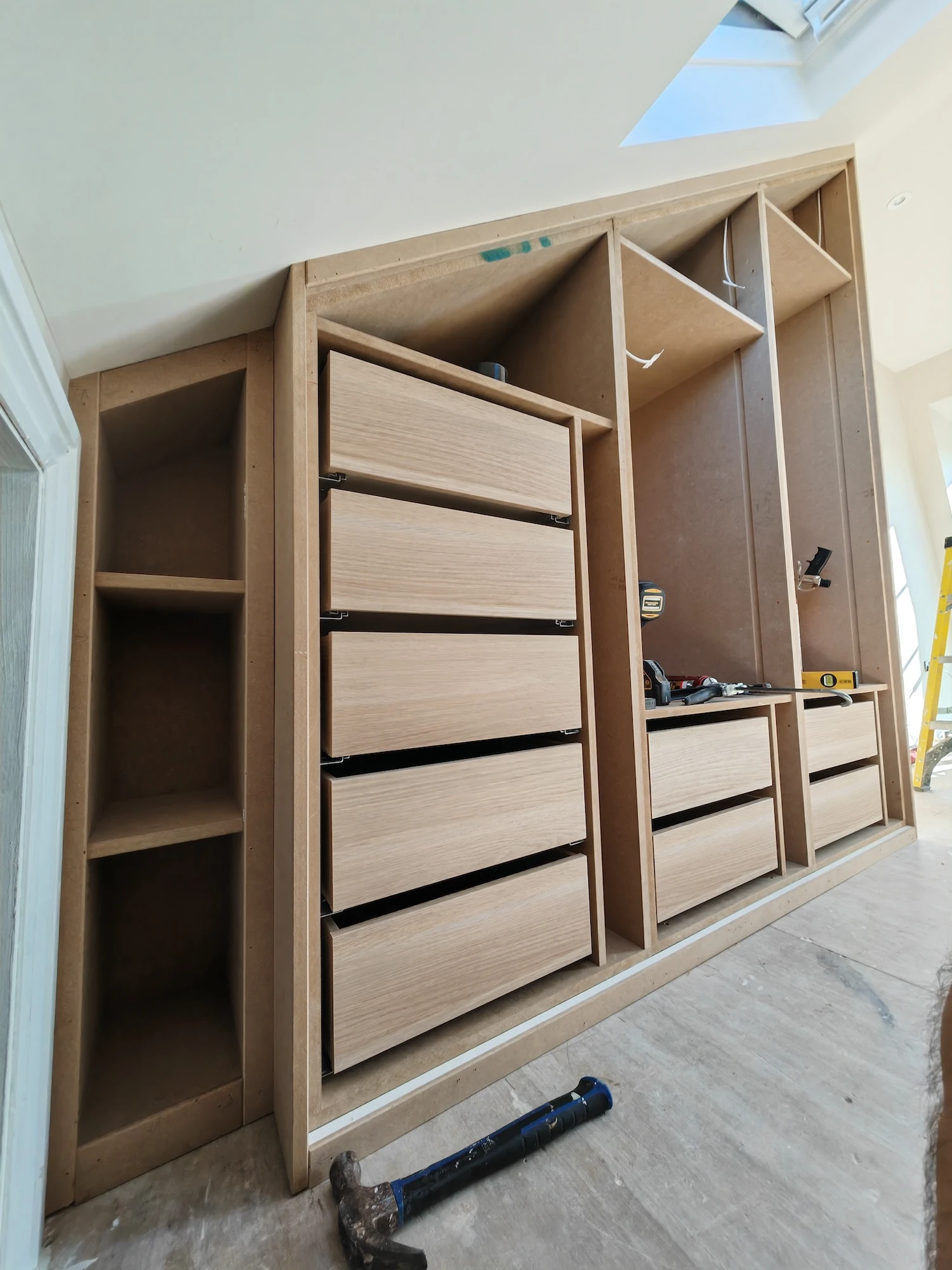 For this project, our client in Chelsea asked us to deliver bespoke joinery as part of their loft conversion and ongoing renovation. The centrepiece of the project is a custom loft wardrobe, thoughtfully crafted to fit under the sloping roofline of their attic space. Designed around IKEA drawers, the wardrobe features expertly angled panels and internal storage that optimises every awkward corner, seamlessly blending practicality with refined aesthetic.