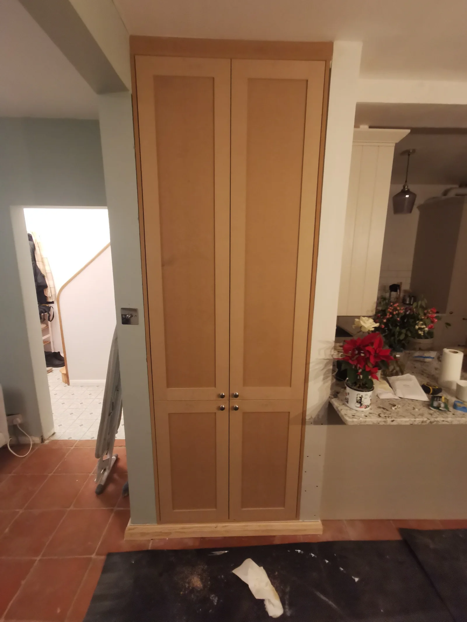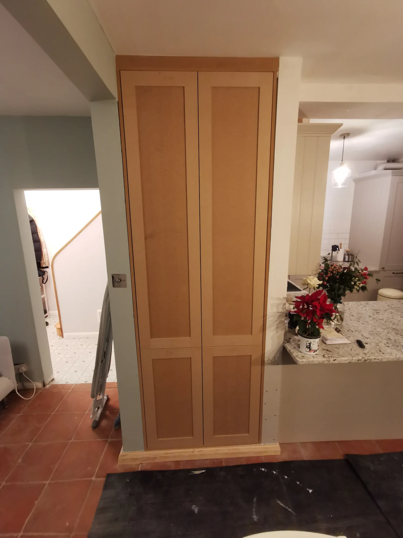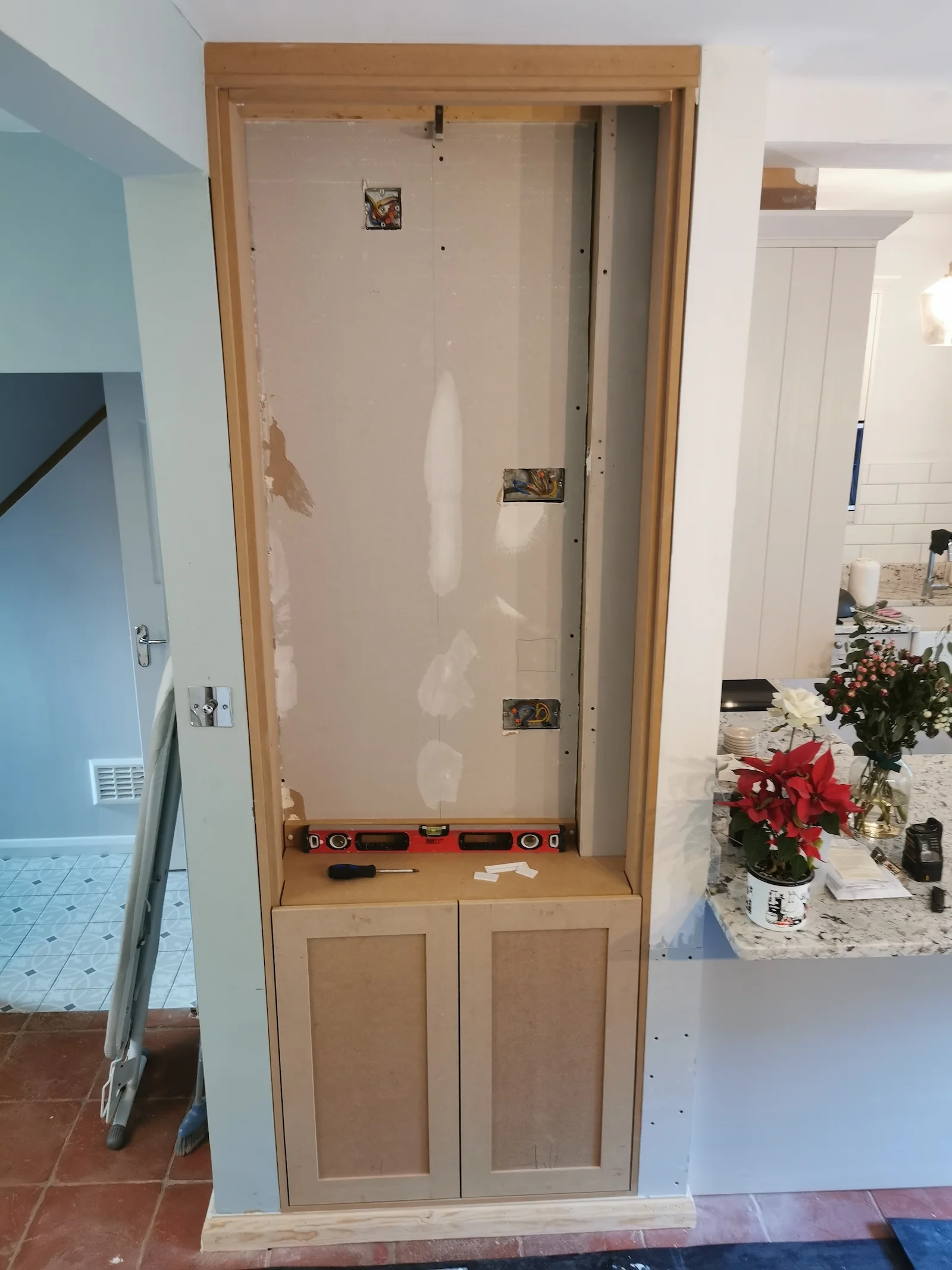 As part of our project scope, we designed and installed a purpose-built storage unit in a designated nook. The deliberate choice of ‘shaker style’ finishing for the doors was made to seamlessly align with the existing furniture of our client’s home, which includes the kitchen and alcove cupboards.