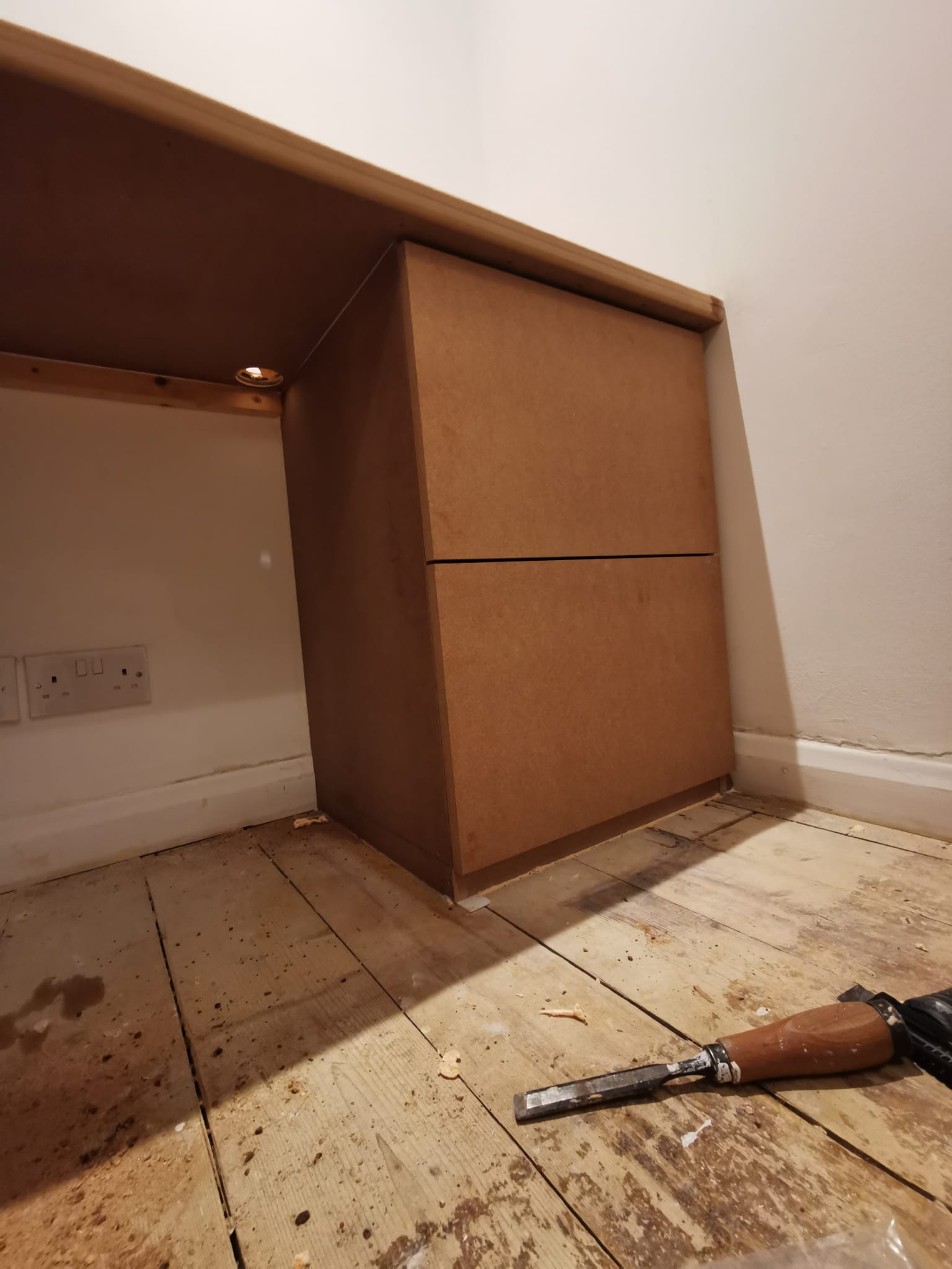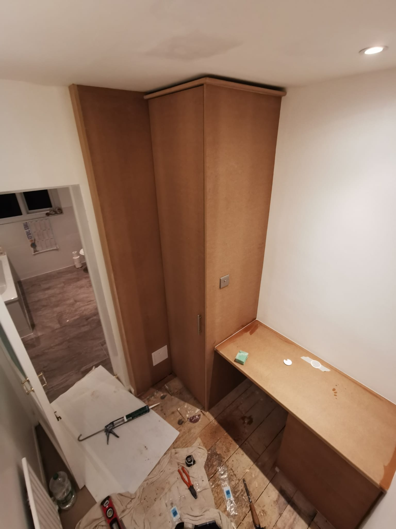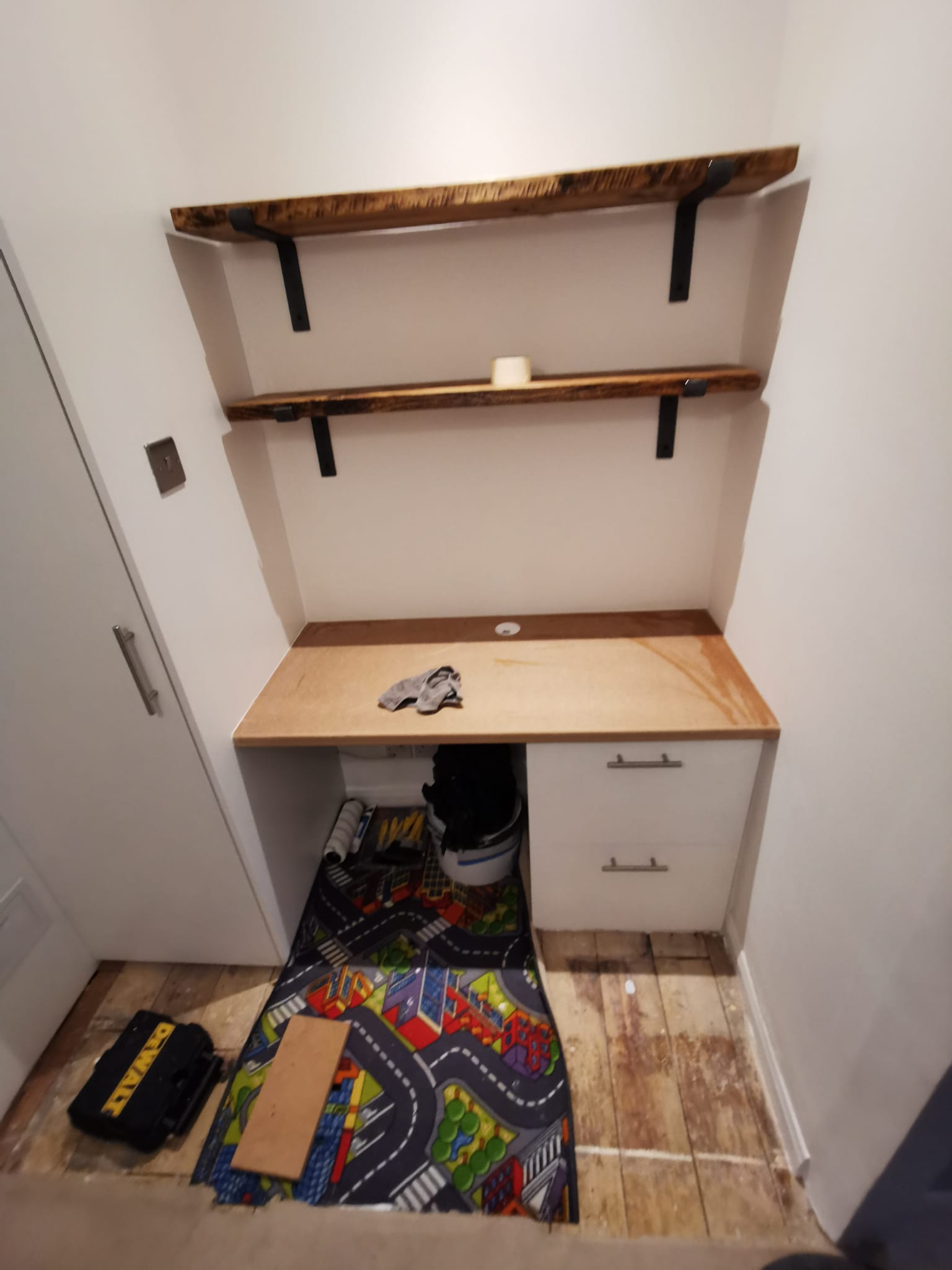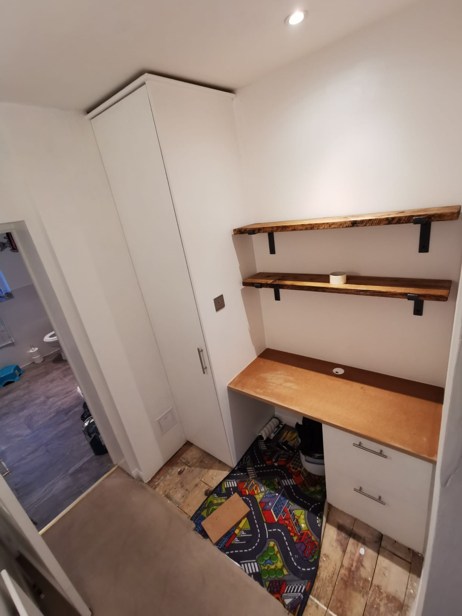 With this project, we turned the unused, empty boiler room into a cosy working space. This involved making a thick, soundproof cupboard for the boiler as well as a custom made desk and shelves made from reclaimed timber.