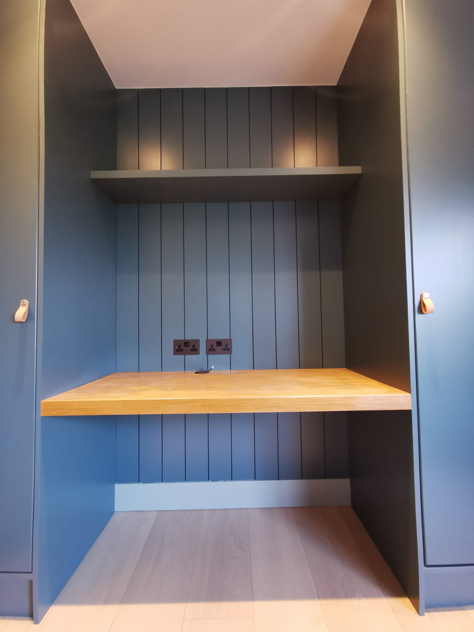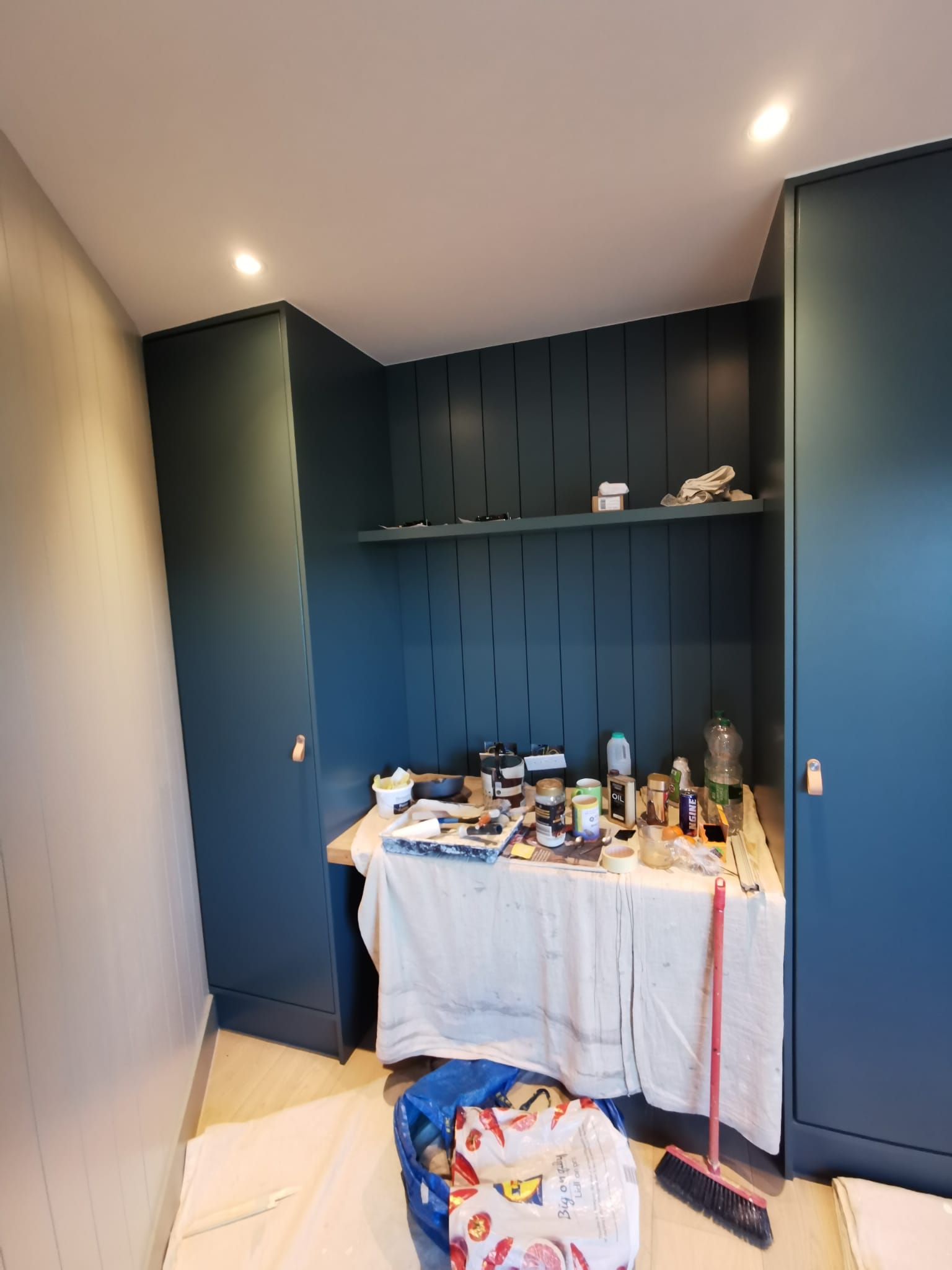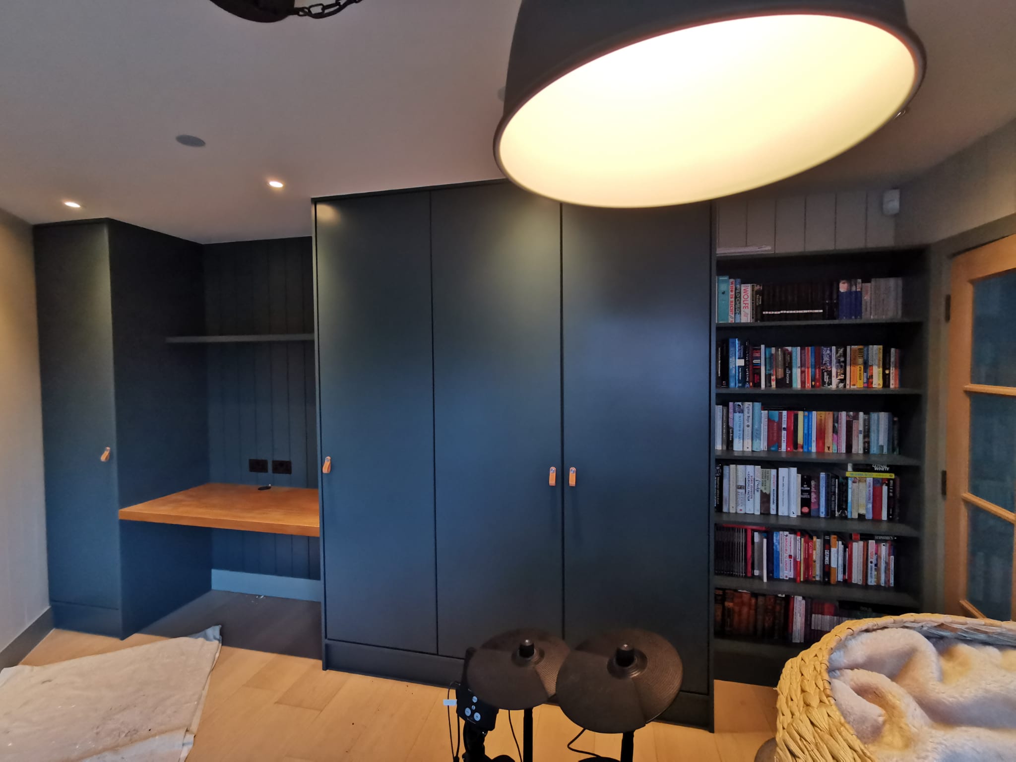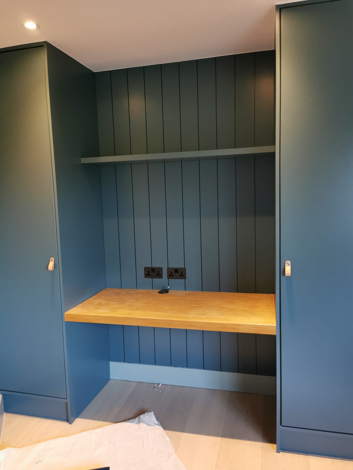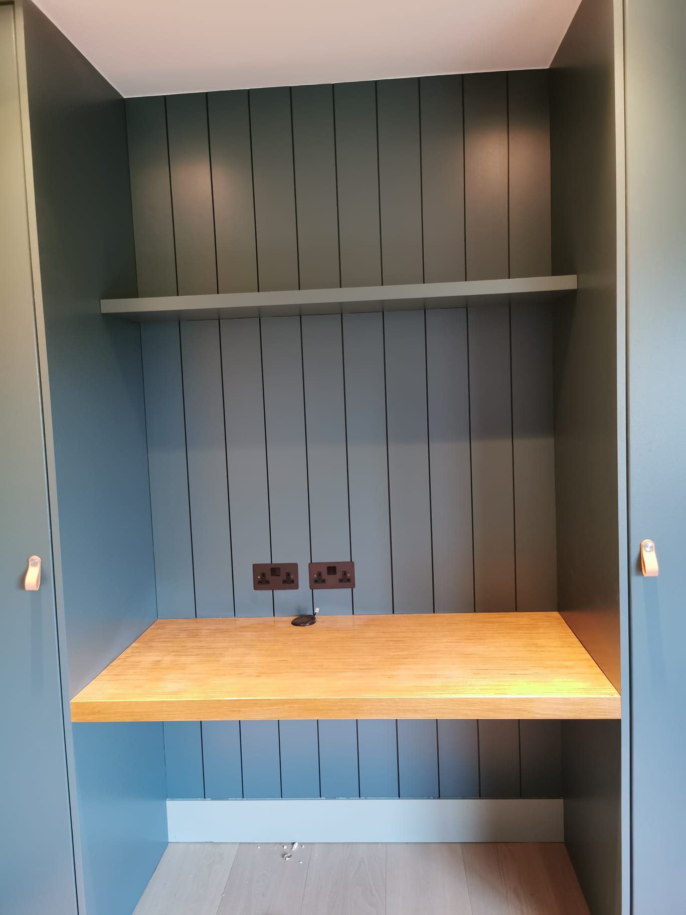 The project involved full carpentry and joinery for the shelf/wardrobe/desk unit along with the final finish. There was also the usual floor installation, plastering, panelling, electrical work, painting and decorating.