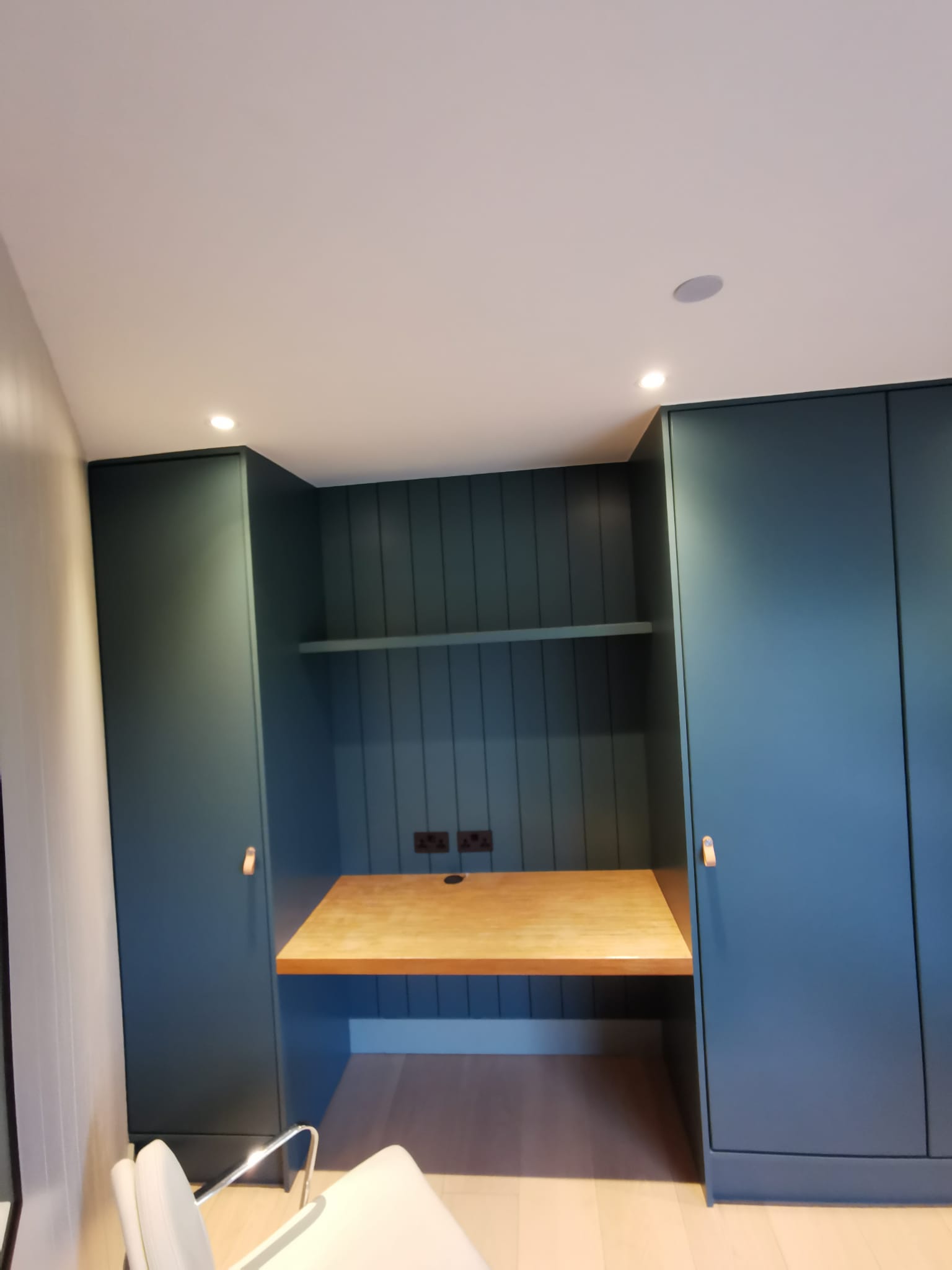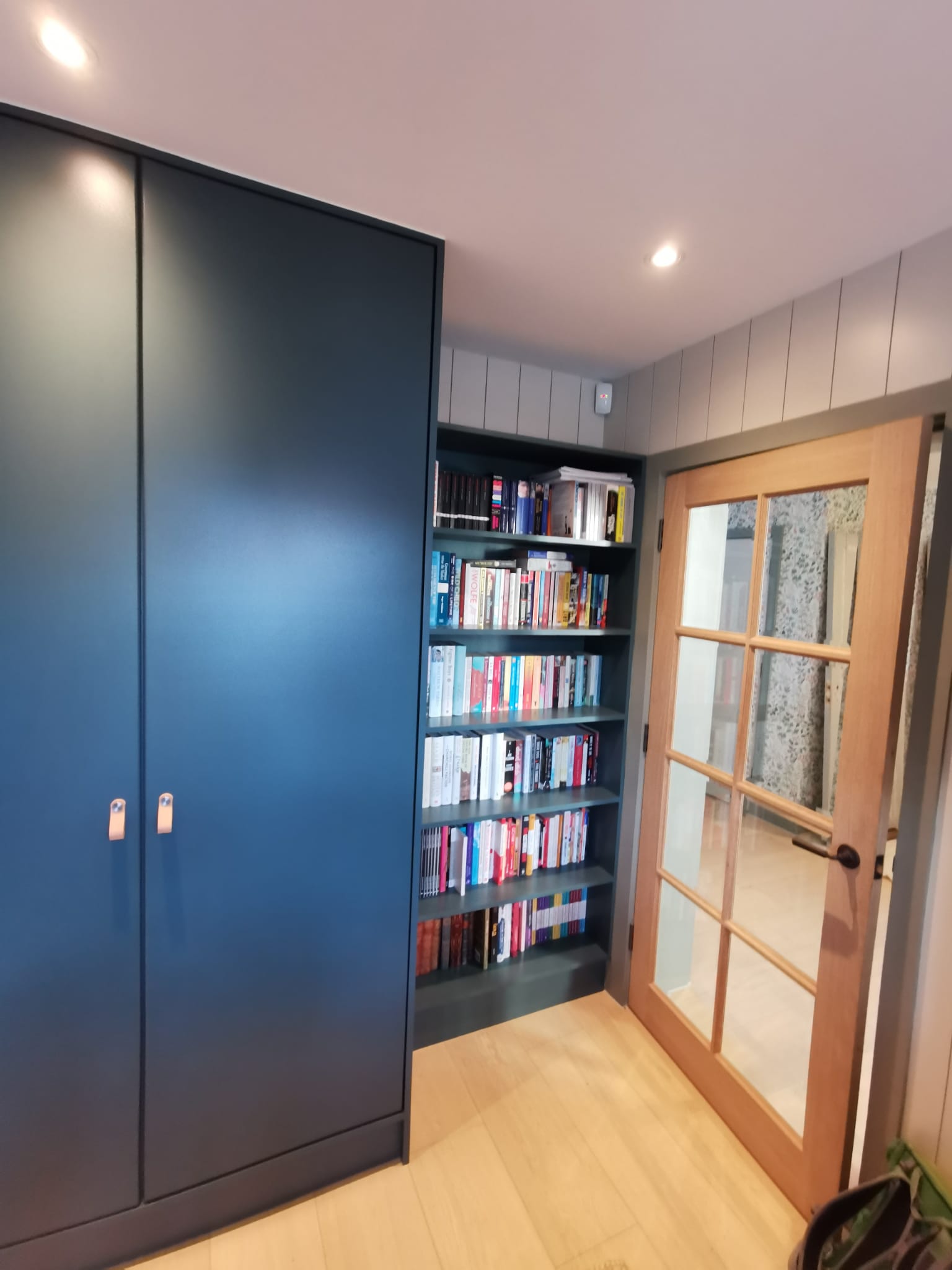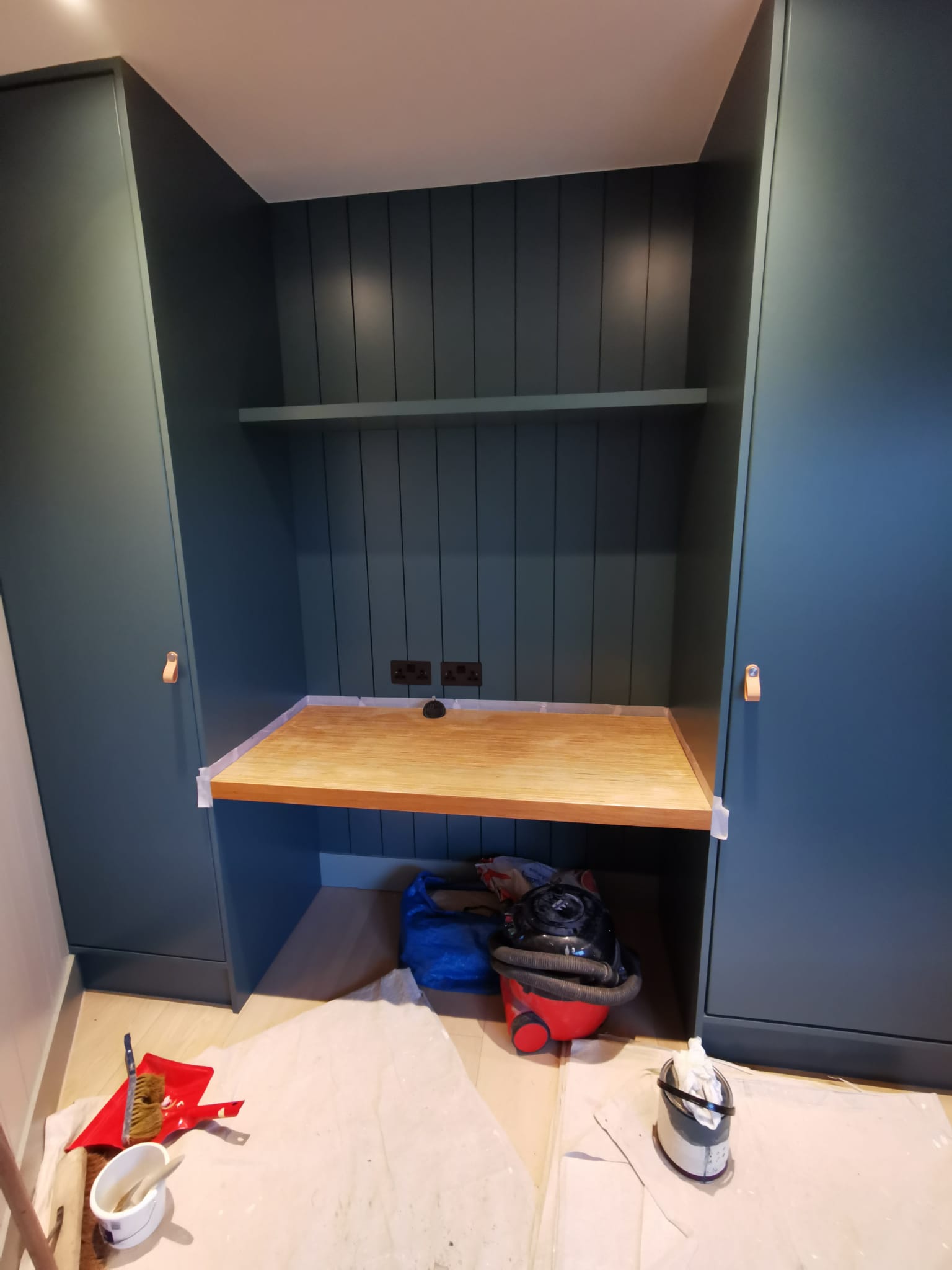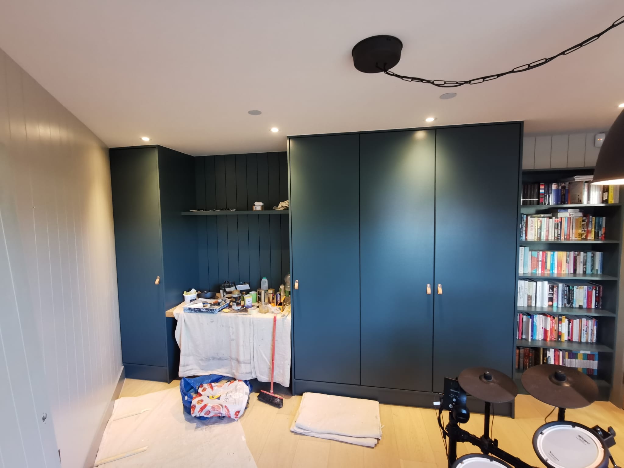 The project involved full carpentry and joinery for the shelf/wardrobe/desk unit along with the final finish. There was also the usual floor installation, plastering, panelling, electrical work, painting and decorating.