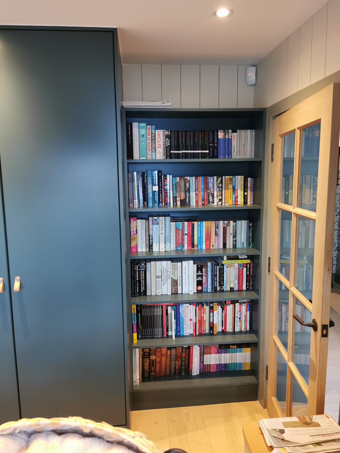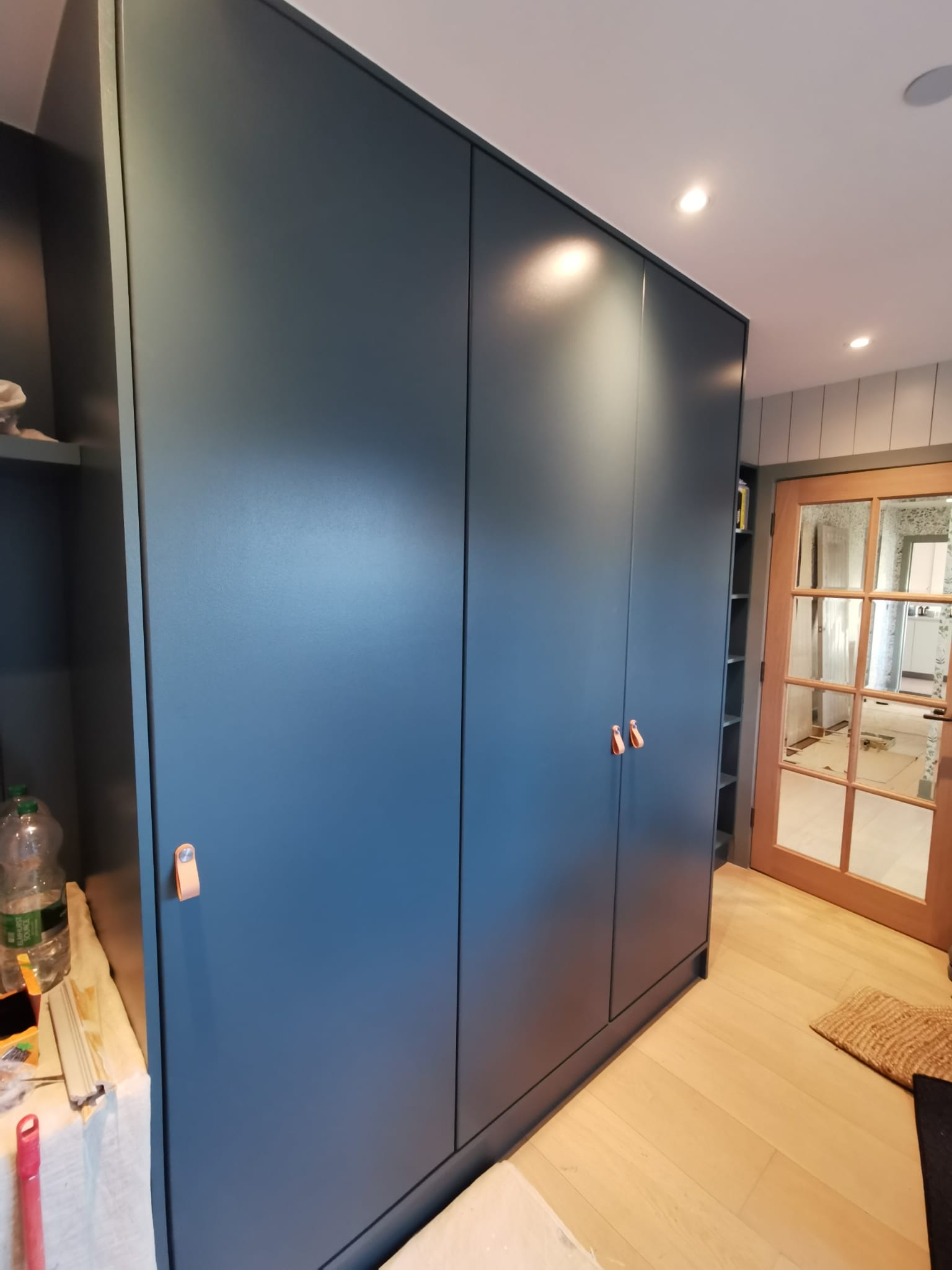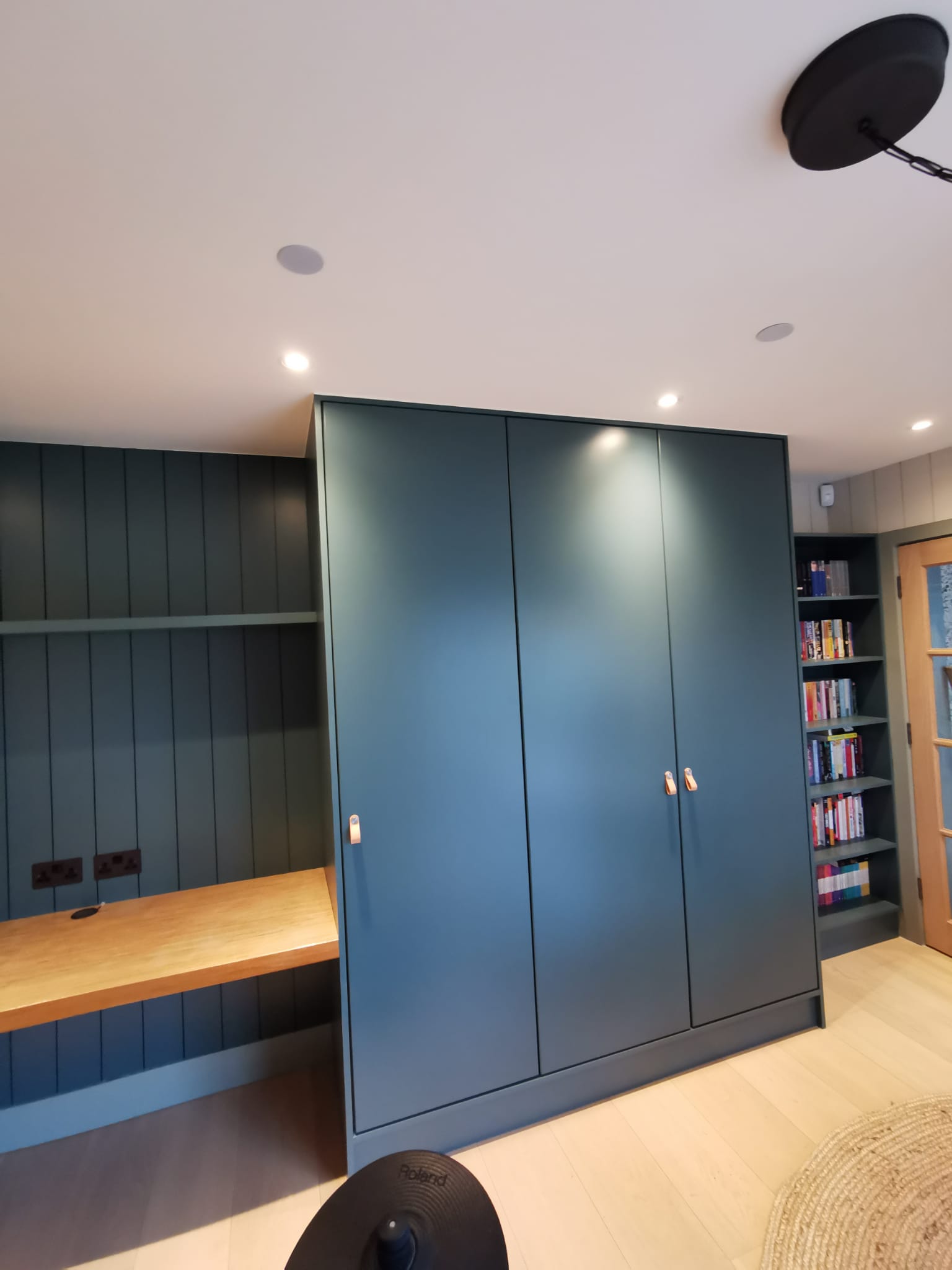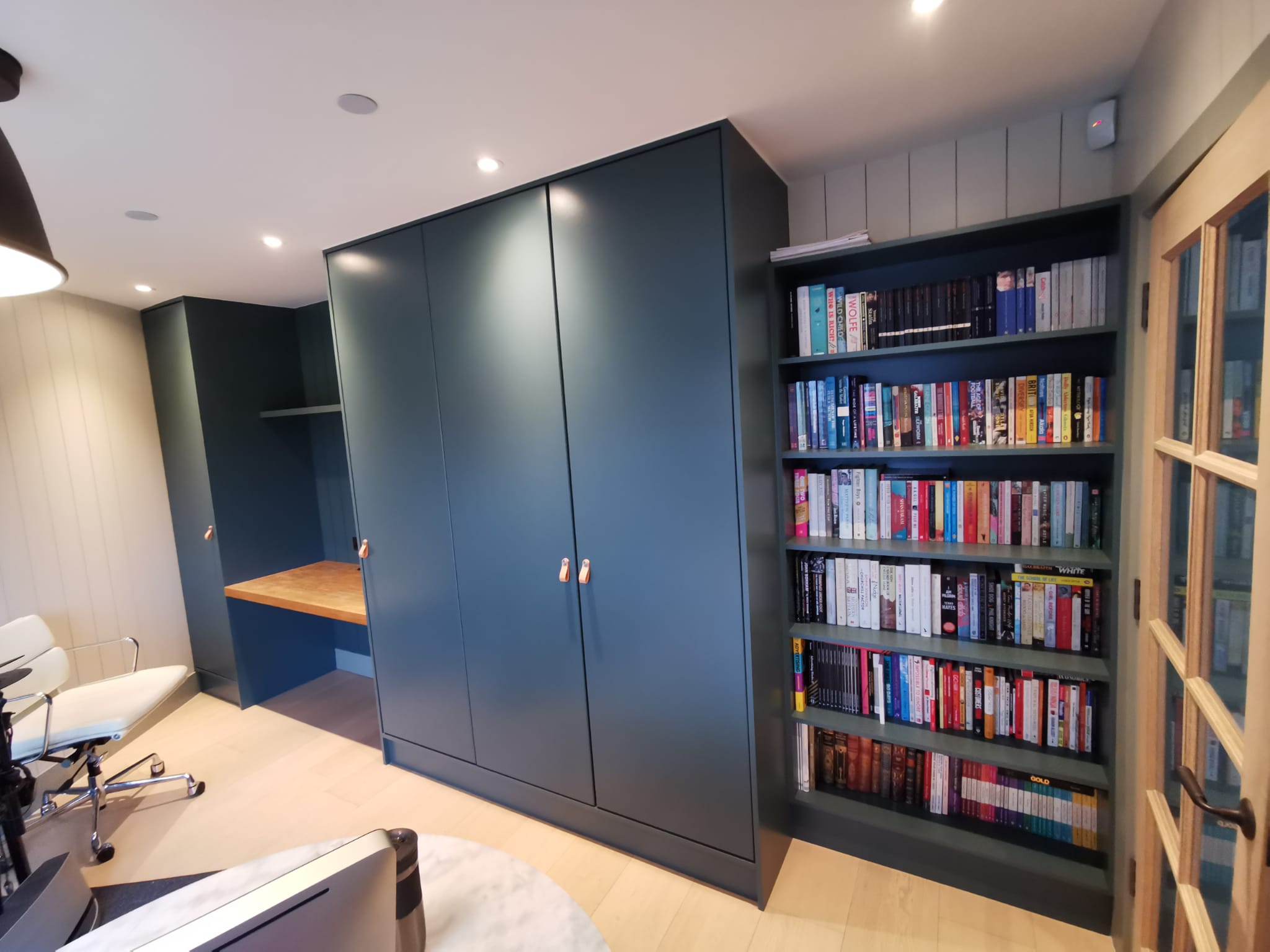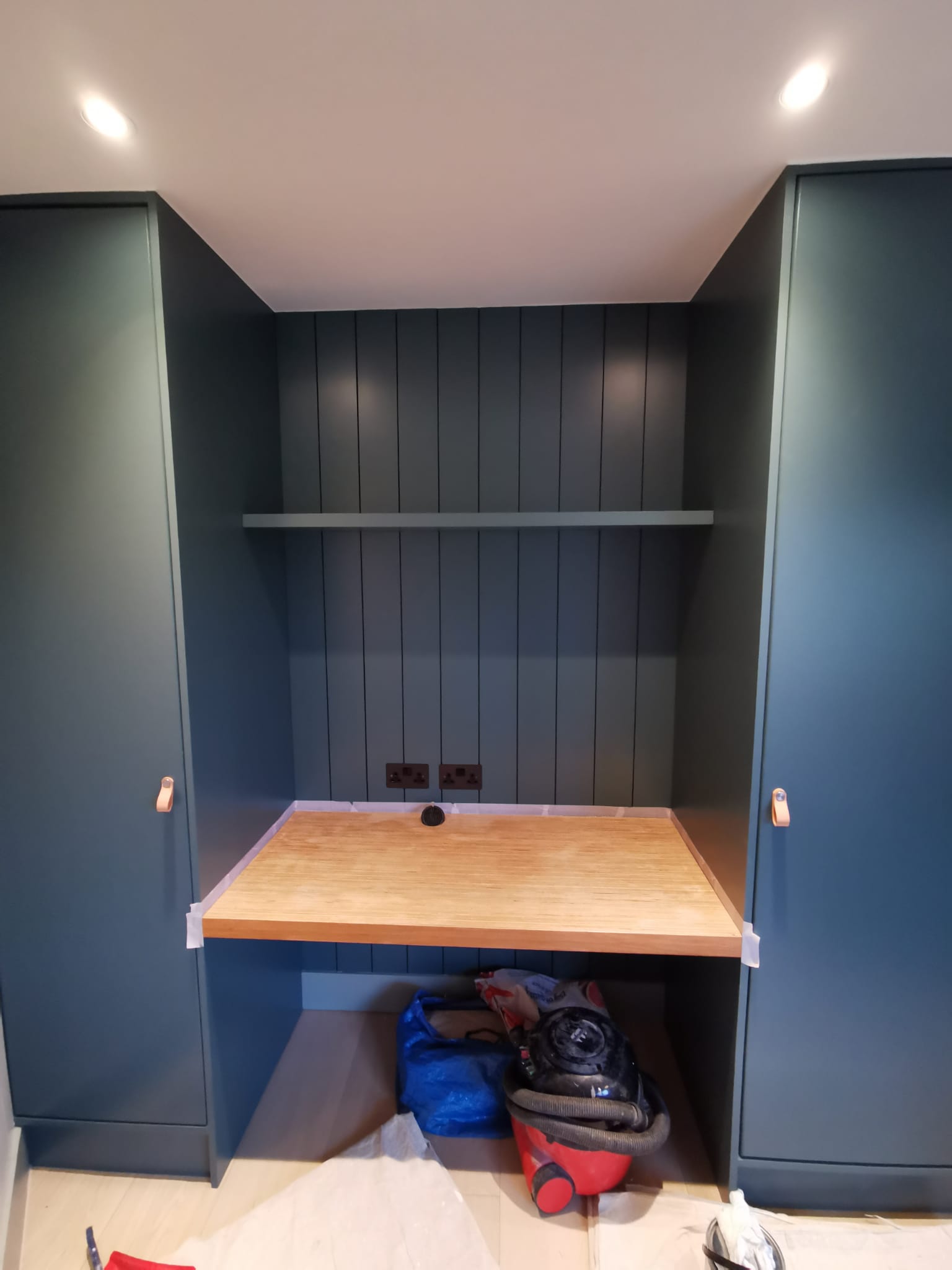 The project involved full carpentry and joinery for the shelf/wardrobe/desk unit along with the final finish. There was also the usual floor installation, plastering, panelling, electrical work, painting and decorating.