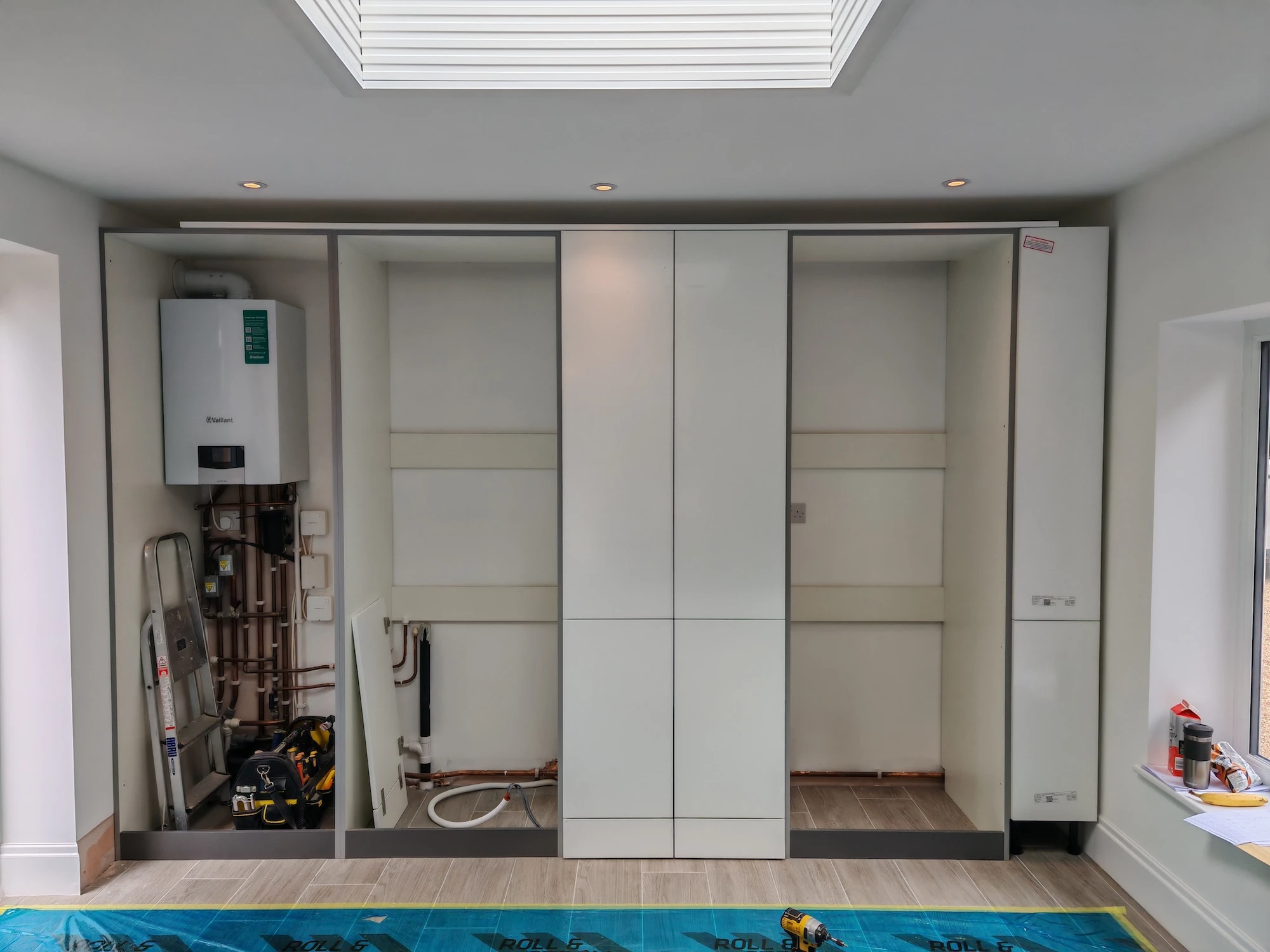 We installed a full run of cabinetry to house the boiler, washing machine and tumble dryer, alongside integrated plumbing for a sink. Several units were deliberately constructed with false backs and reduced depths to accommodate pipework and services without compromising the overall appearance.